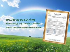 Risen Energy’s Hyper-ion series HJT modules have achieved a new breakthrough in France’s carbon footprint certification, with a certified value of 301.765 kg eq CO₂/kWc — nearly 19% lower than conventional modules—setting a new benchmark for low-carbon manufacturing in the PV industry.
